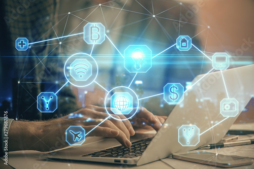 Social network theme hologram with businessman working on computer on background. Concept of world wide web. Double exposure.