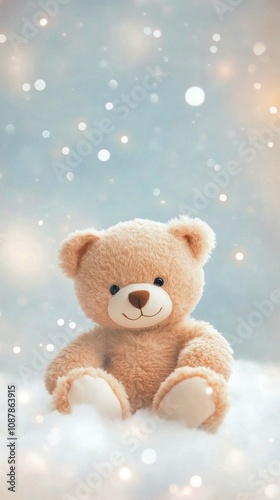 Soft bear sitting on fluffy clouds with blue background during a serene moment