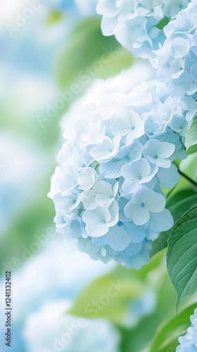 Soft blue hydrangea blossoms in full bloom with lush green leaves in a serene garden setting