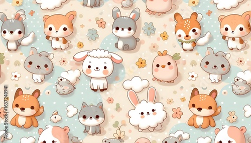 Soft colored cartoon animal design in whimsical and charming repeating wallpaper pattern