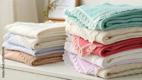 Soft cotton fabrics stacked neatly in pastel colors with lace trim
