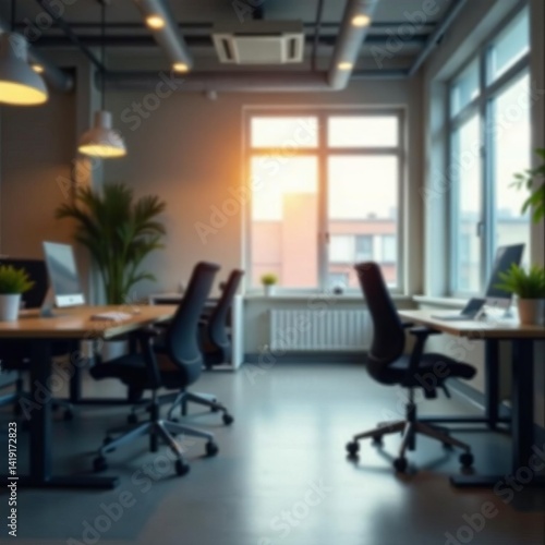 Soft focus office interior with glowing light bokeh and ergonomic furniture, corporate, design, decoration