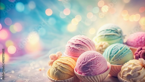 Soft focus pastel hued background features a colorful swirl of creamy ice cream scoops in gentle, whimsical arrangement, evoking feelings of sweetness and serenity.