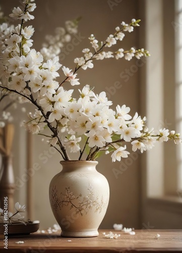 Soft focus white cherry blossoms in vintage vase on blurred background, simplicity, vintage aesthetic, interior, elegance