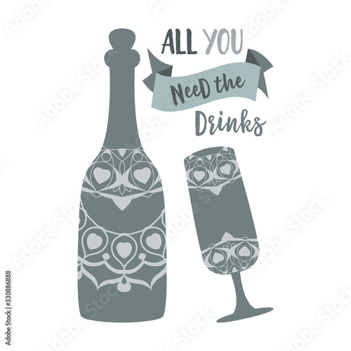 Soft grey color of bottle and glass with modern chinese mandala design. Vector