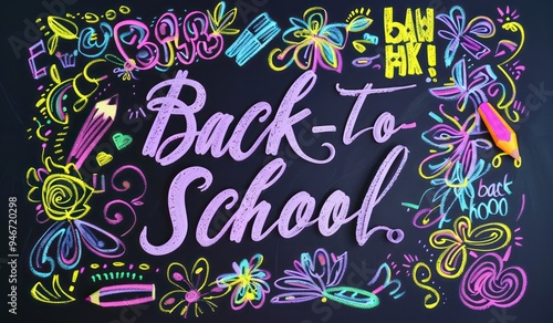 Soft lavender blackboard with vibrant chalk doodles and back-to-school in a fun font, great for funny posters