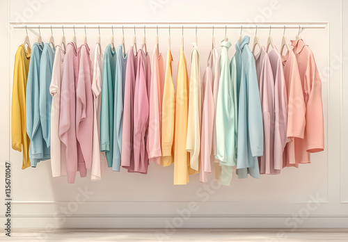 Soft Pastels on Display: A vibrant collection of soft pastel-colored garments hangs neatly on wooden hangers, ready to dress up a modern wardrobe. The array presents a spectrum of fashion choices.