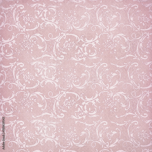 Soft pink vintage scroll damask pattern with distressed texture. Perfect for romantic stationery, feminine décor, wallpaper, and shabby-chic design projects.