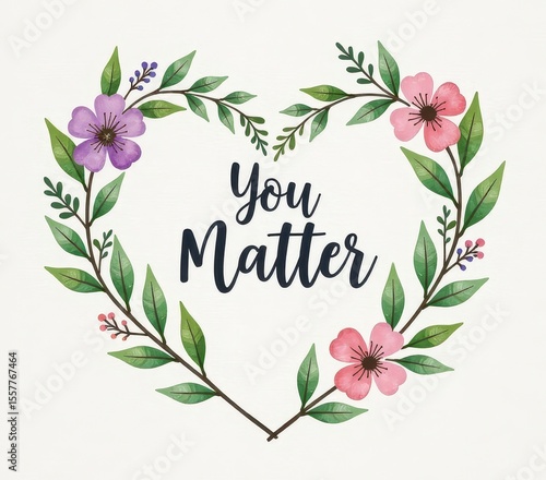 soft watercolor illustration with lettering “You Matter” centered inside a heart-shaped floral wreath, wildflowers, herbs, eucalyptus, subtle gold accents, light textured paper background