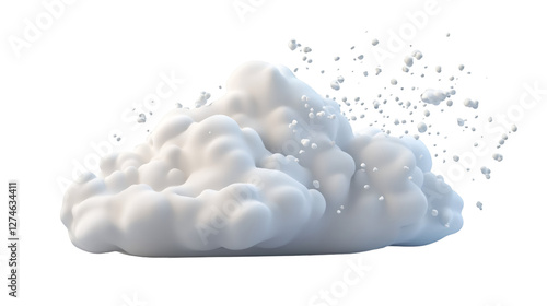 Soft white cloud generating delicate foam particles through digital rendering, floating against transparent background with minimalist aesthetic
