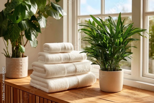 Soft white towels neatly stacked beside healthy green plants in a sunlit indoor setting in morning light
