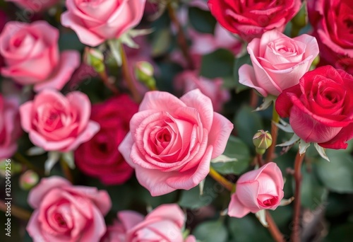 Soft-focus background of pink and red roses, romantic floral backdrop, roses, botany