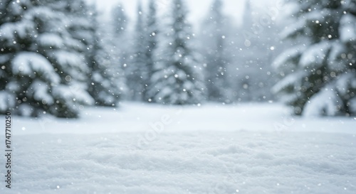 Softly falling snow in a serene winter forest with snowcovered pine trees in the background for commercial usage and mockups