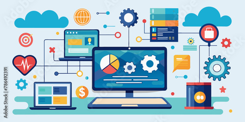 Software, web development, programming concept. Abstract Programming language and program code on screen laptop. Laptop and icons company network. Technology process of Software development. Vector
