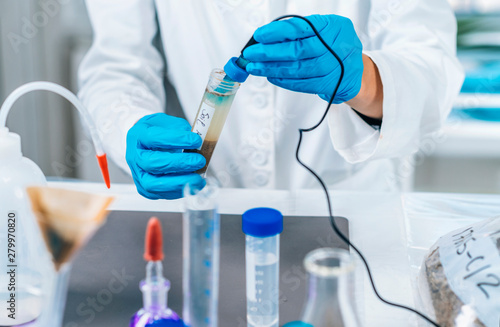 Soil Laboratory Analysis. Scientist Measuring PH Of Soil Sample