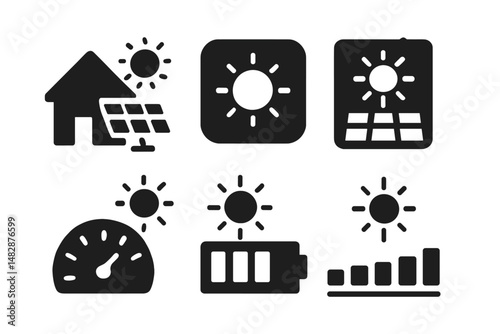 Solar energy icons illustrating renewable power sources, efficiency indicators, and storage solutions
