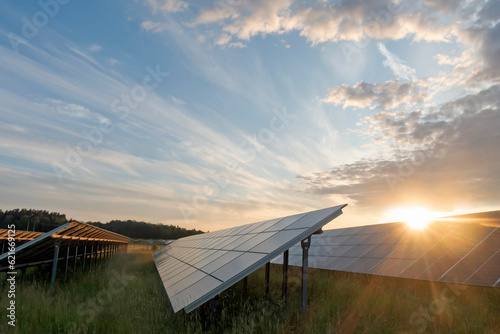 Solar panels at orange sunset, with blue sky