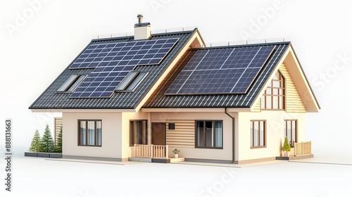 Solar-paneled house in 3D, focused and well-lit, presented on a white background.