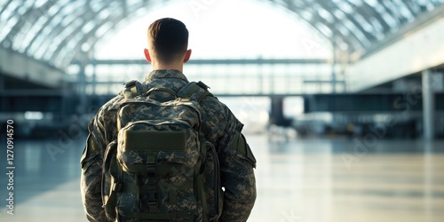 Soldier waiting at an airport, possibly about to deploy or return from a mission.