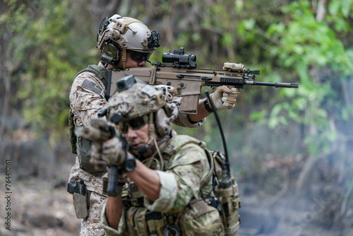 Soldiers in tactical gear aiming guns during a military exercise, showcasing teamwork and defense strategies.