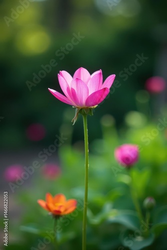 Solitary pink flower blooming, peaceful garden setting , plant, soft