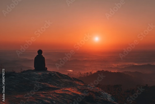 Solitary soul perched on dawn-kissed peak, embracing solstice sunrise meditation, spiritually infused wanderlust with vibrant tranquility vibes