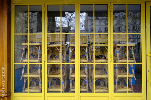 Some chairs piled up at some closed restaurant in Paris the 26th march 2021, due to the covid19 pandemic.