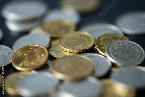 Some Polish coins scattered on a dark background close up
