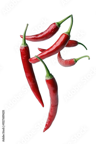 some red chili peppers or cayenne falling or flying on transparent background in vertical image proportion