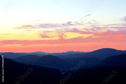 Sonnenuntergang im Sommer im Pfälzerwald. Aussicht von der Burgruine Drachenfels bei Busenberg in der Verbandsgemeinde Dahner Felsenland in Rheinland-Pfalz.