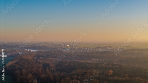 Sonnenuntergang über dem Fluss und der Stadt bei klarem Wetter mit Blick auf die Umgebung