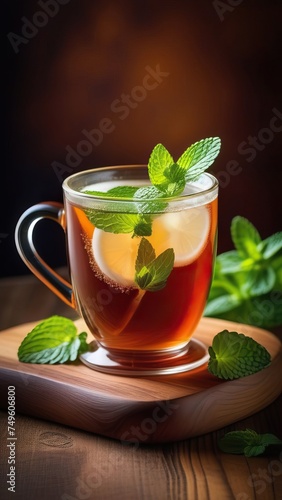 Soothing cup of tea with fresh mint leaves, placed elegantly on rustic wooden table, invoking sense of calm and relaxation. Cup of tea infused with lemon and aromatic mint leaves, blend of flavors.