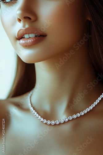 Sophisticated close up shot showcasing a stunning woman wearing a luxurious diamond necklace highlighting her allure : Generative AI