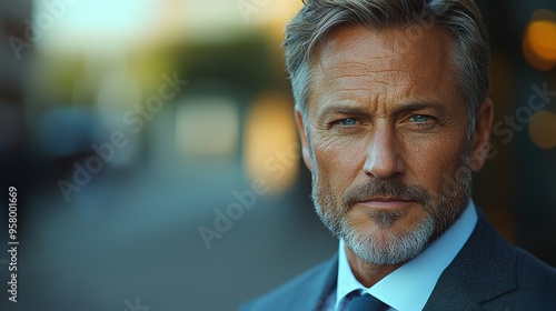 Sophisticated man in business attire standing confidently on a city street during the golden hour of twilight