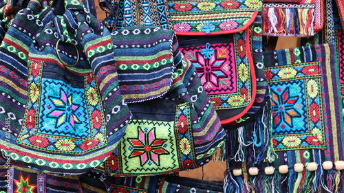 Souvenir market in Yaremche. Shoulder bags with ethnic Ukrainian designs are on sale in the Carpathians.