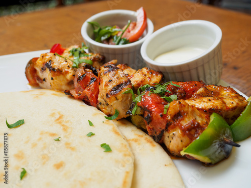 Souvlaki or kebab, grilled meat skewer and pita bread
