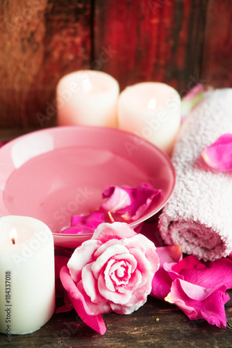 Spa settings with roses. Fresh roses and rose petals in a bowl of water and various items used in spa treatments