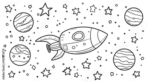 Space rocket illustration with planets and stars. Simple line art. Suitable for coloring book