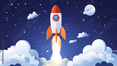 Space rocket launching, dark blue background with clouds. Innovation and startup concept. Space technology, rocket science, cosmic exploration.