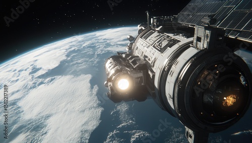 Spacecraft orbiting Earth, illuminated by sunlight, complex design. Detailed view of a large, modern spacecraft. Visible Earth in the background