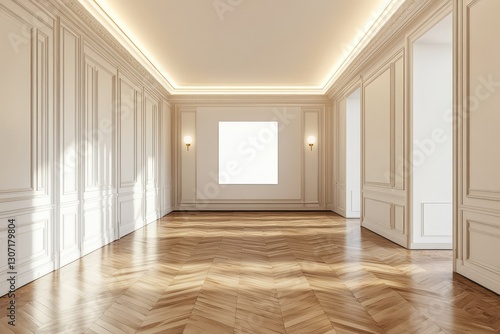 Spacious empty hall with blank white poster. AI generated illustration.