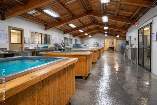 Spacious fish hatchery interior with tanks and wooden ceiling.
