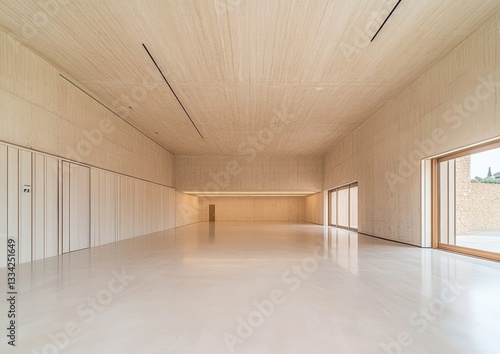 Spacious Modern Empty Room with Wooden Walls and Large Windows