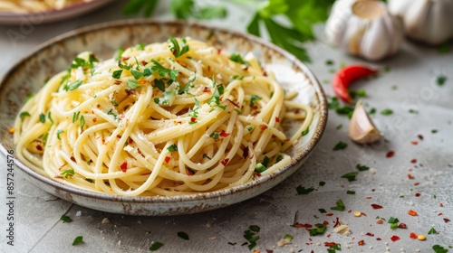 Spaghetti Aglio e Olio with Garlic, Chili Flakes, and Parsley in a Commercial Photography Shot