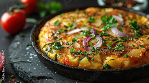 Spanish omelette with potatoes and onion, typical Spanish cuisine. Tortilla espanola.