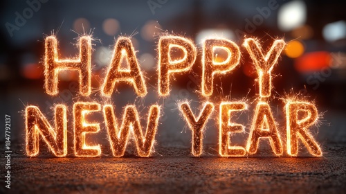 Sparkler-Lit 'Happy New Year' Display on Urban Nighttime Background