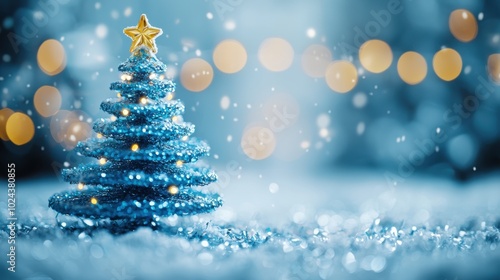 Sparkling blue Christmas tree adorned with golden star, glowing softly with fairy lights. Background features soft bokeh and falling snowflakes, creating a festive holiday mood.