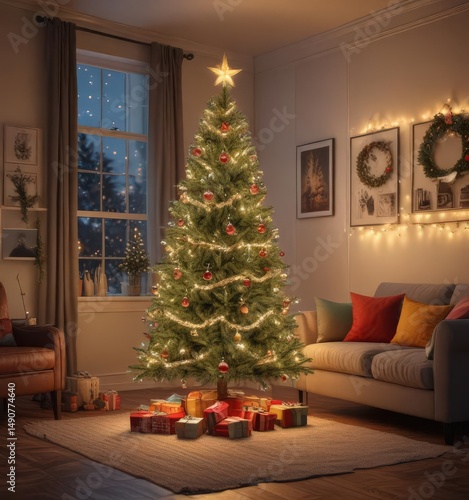 Sparkling Christmas tree in cozy living room, colorful lights, festive mood, shine, room, winter holidays