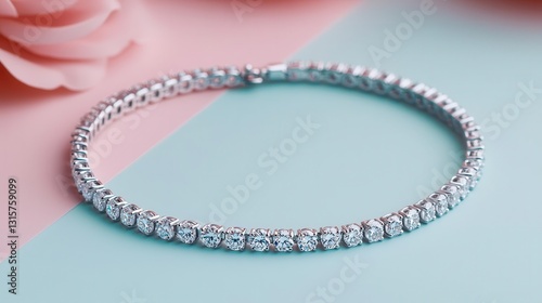 Sparkling diamond tennis necklace displayed in a Ushape, isolated on a clean ivory surface