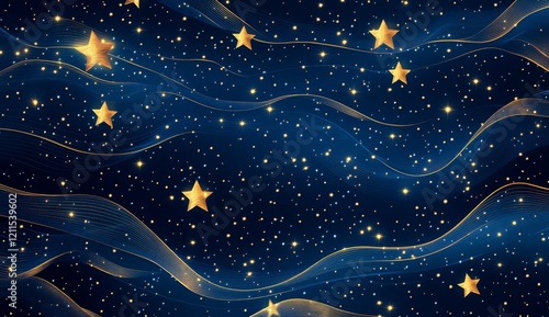 Sparkling golden stars on wavy blue night sky background.